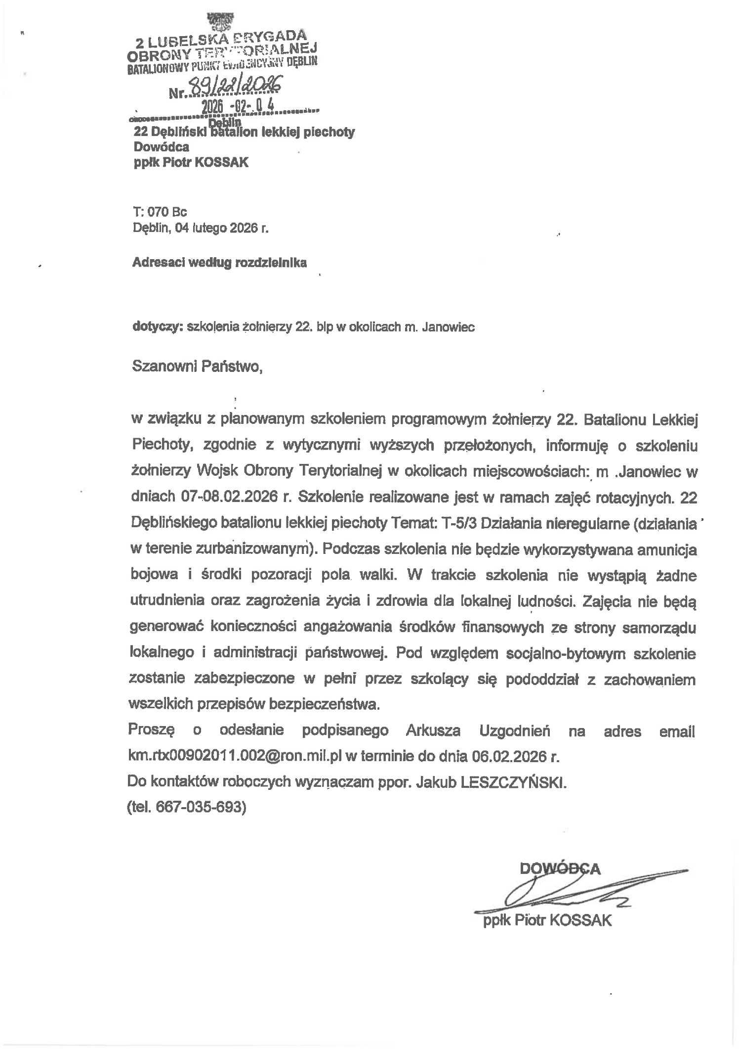 Ćwiczenie Wojsk Obrony Terytorialnej na terenie Gminy Janowiec w dniach 07-08.02.2026