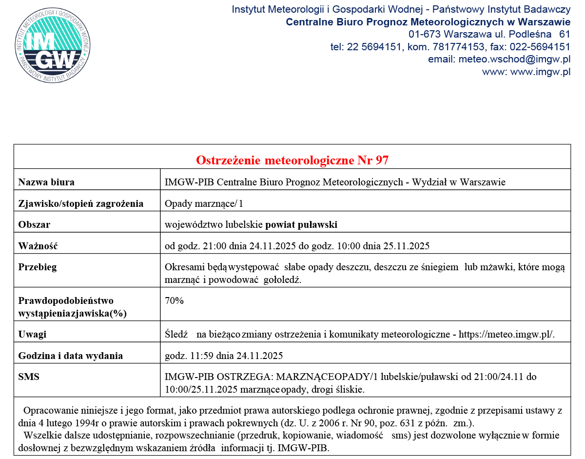 IMGW: Ostrzeżenie przed marznącymi opadami