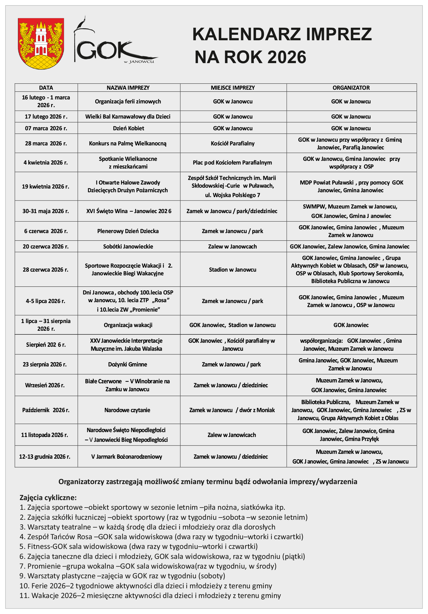 Kalendarz Imprez na rok 2026
